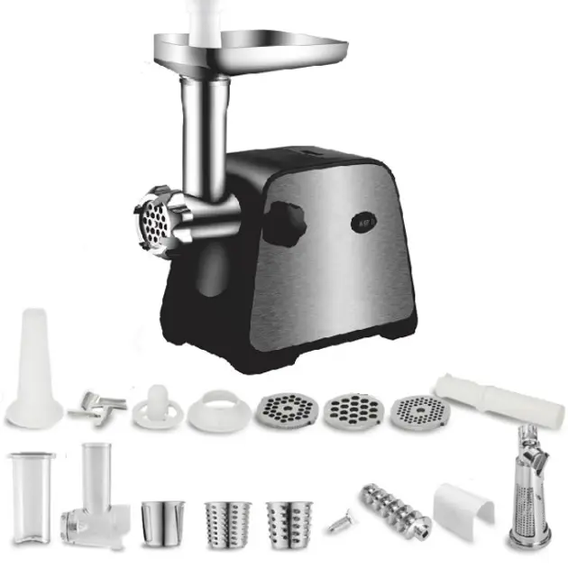 М'ясорубка оснащена трьома металевими ґратами для різного ступеня подрібнення, насадками для ковбас, кеббе, соковижималкою для томатів та цитрусових, а також терками та шатківниками. Функція реверсу дозволяє швидко усунути інгредієнти, що застрягли, а захист від перегріву продовжує термін служби приладу. Це незамінний помічник для приготування фаршу, домашніх ковбас, соку та салатів.