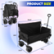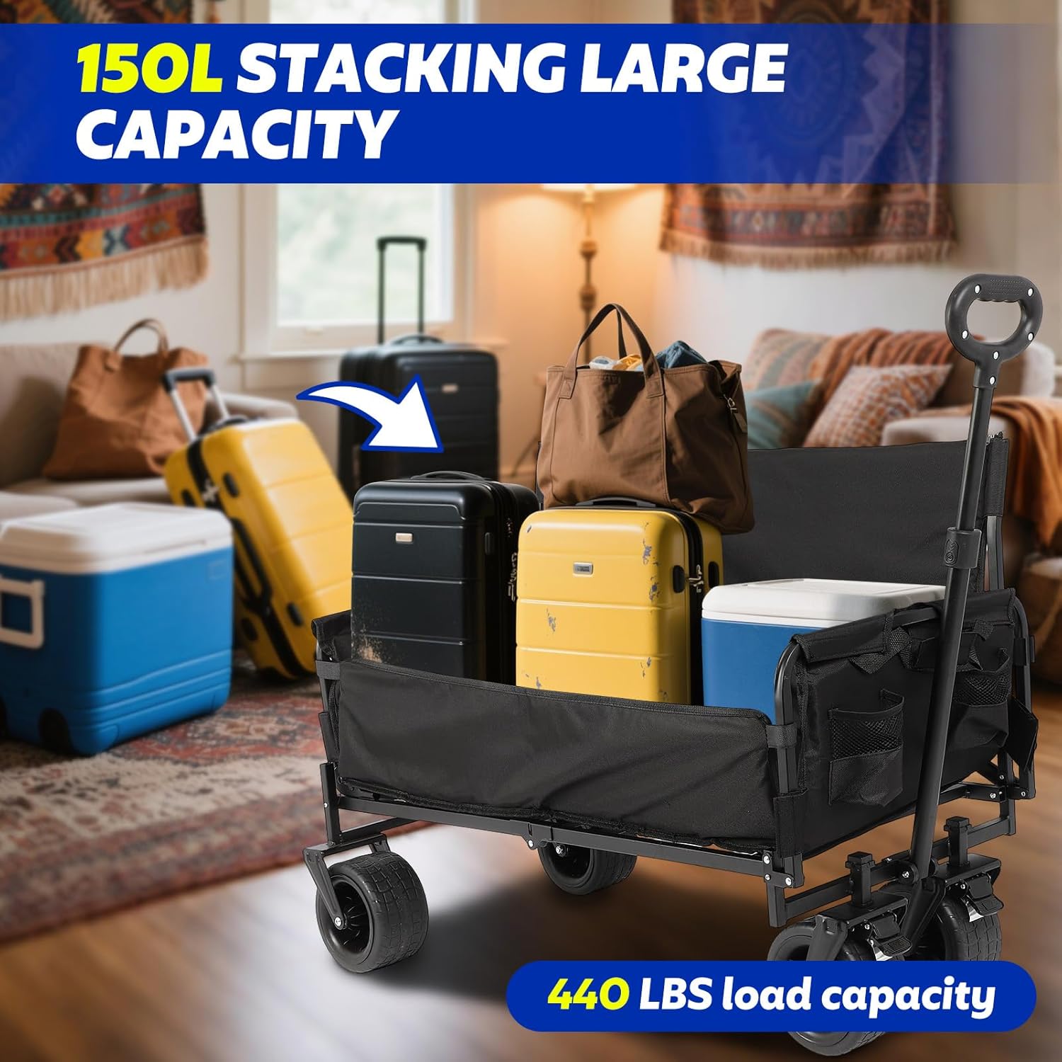 Наш доладний фургон має міцну раму з потовщеної вуглецевої сталі з вантажопідйомністю до 440 фунтів, а тканина виготовлена з потовщеної двошарової тканини Oxford 600D, яка є водонепроникною та зносостійкою. Незалежно від того, чи перевозите ви продукти, спорядження або садове приладдя, цей 4-колісний візок легко впорається з важкими завданнями.