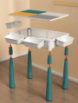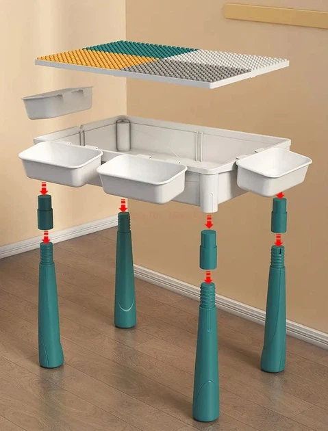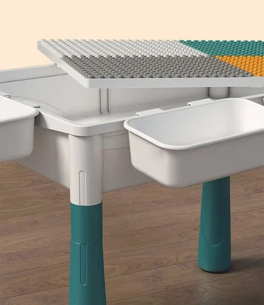 Верхня панель столу двостороння: одна сторона оснащена чотирма зонами для гри з конструктором (з великими та дрібними осередками), а інша – гладка, ідеальна для навчання, малювання чи занять.