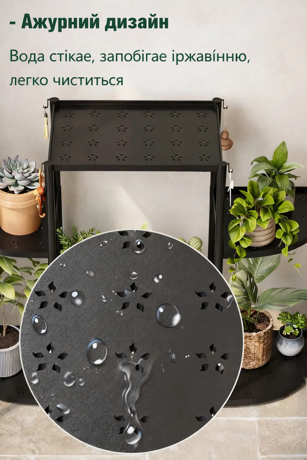 Підходить для розміщення різних рослин, декоративних елементів та аксесуарів. Зручне зберігання поливальних інструментів, горщиків та іншого садового приладдя.