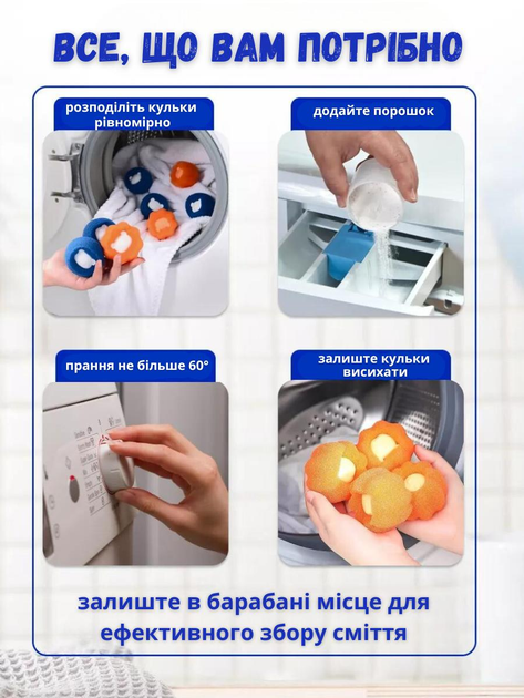 Простота використання: достатньо додати кульки разом із речами до пральної машини перед початком прання.