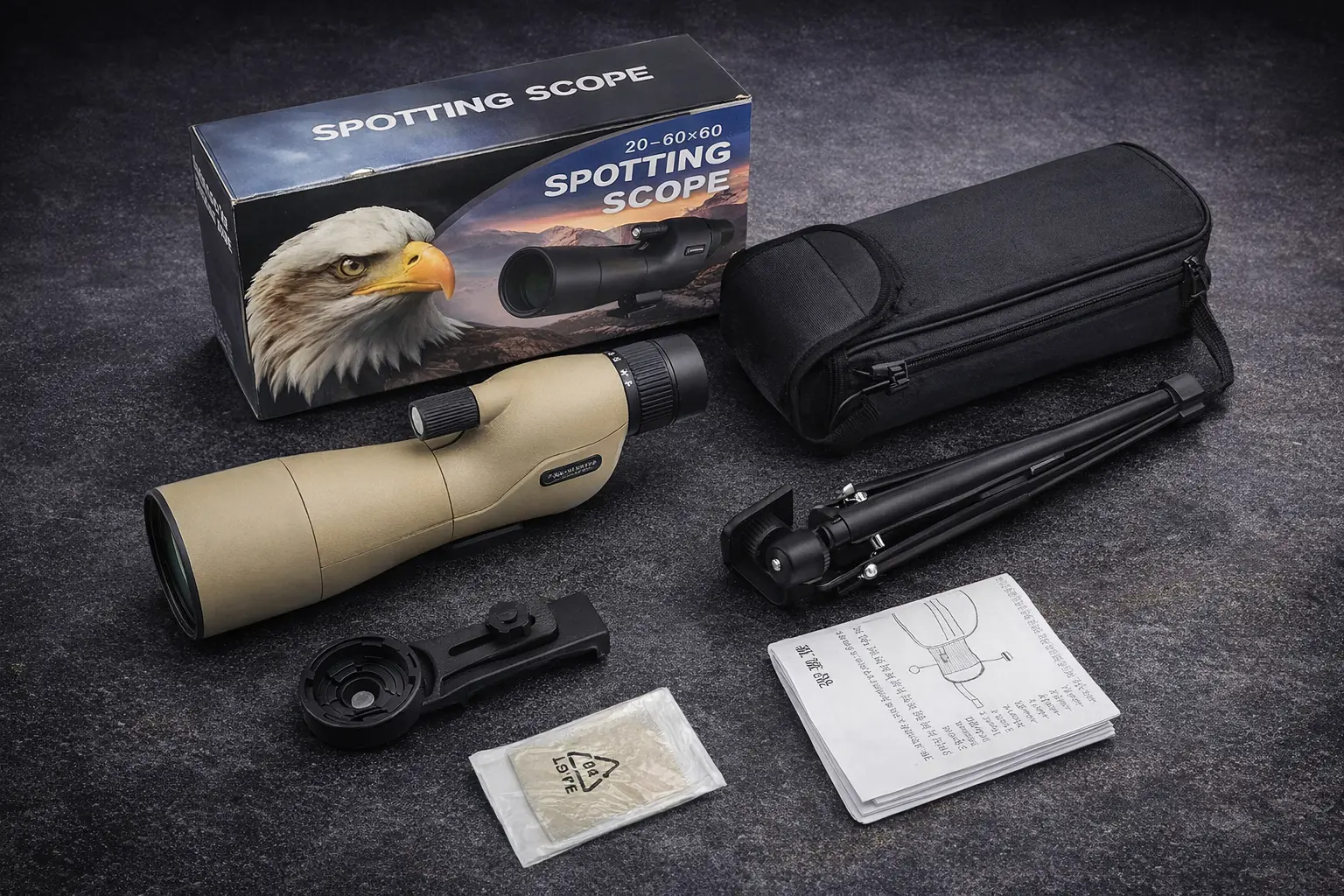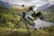 Монокуляр оснащений штативом для стабільності при спостереженні та утримувачем телефону, що дозволяє робити фотографії віддалених об'єктів.