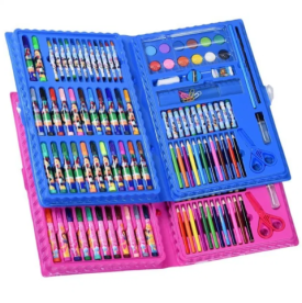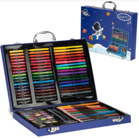 Набір для творчості у складній валізі, прикрашеній космічними мотивами. Це ідеальний подарунок для будь-якого маленького художника, який відкриває світ уяви та креативності! Набір містить до 133 різних елементів, які дозволять дитині скуштувати різні техніки малювання. У комплекті ви знайдете акрилові маркери, двосторонні маркери, що поєднують тонкий і товстий кінчик, що дозволяє малювати як точні деталі, так і великі поверхні.