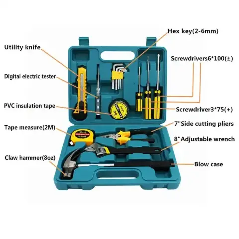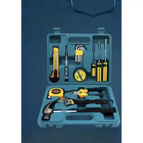 Він включає викрутки для монтажу/демонтажу різьбових з'єднань, у тому числі і дрібних, розвідний ключ для болтів та гайок, ніж для різання щільних матеріалів, рулетку для проведення вимірів, молоток, плоскогубці, шестигранники та тестер напруги. Переваги: ​​надійність і міцність - всі деталі набору виготовлені з інструментальної сталі, робочі частини пройшли загартування.