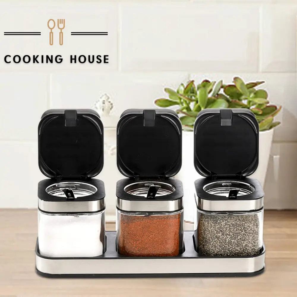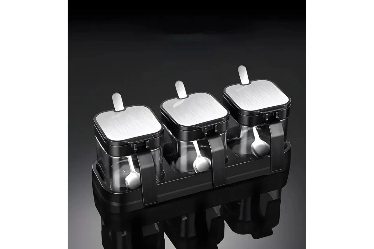 Набір «Три в одному» – набір з 3-х контейнерів для цукру, солі або різних спецій, виготовлений зі скла без свинцю, ложки з нержавіючої сталі 304, нетоксичні, нешкідливі для людей. Основа та кришки мають основу з ABS-пластику, дизайн горловини пляшки великого діаметру, легко брати та очищати. Найкращий вибір для підтримки здоров'я вашої родини.