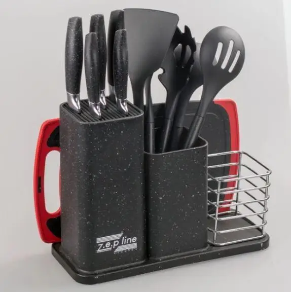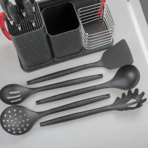 Набір кухонного приладдя на підставці стане незамінним та надійним помічником на Вашій кухні. Набір складається з 14 предметів, необхідних для кожної господині.