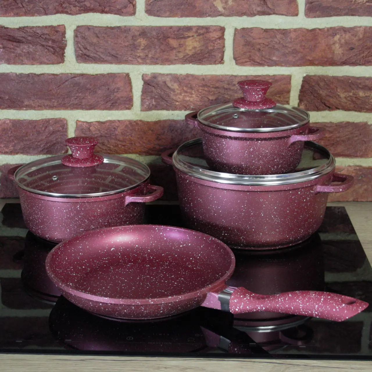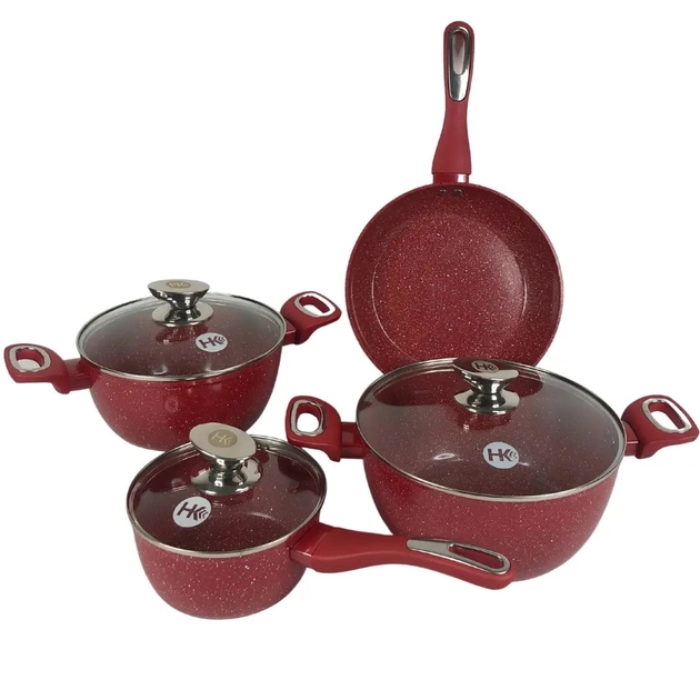 Набір посуду та сковорода зі скляною кришкою виконаний з товстого алюмінію – міцний, екологічний, зручний у використанні.