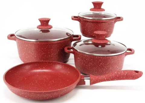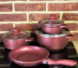 Набір виготовлений з кованого алюмінію, має товсті стінки та дно, що найкраще підходить для рівномірного розподілу та збереження тепла, а також відрізняється високою міцністю.