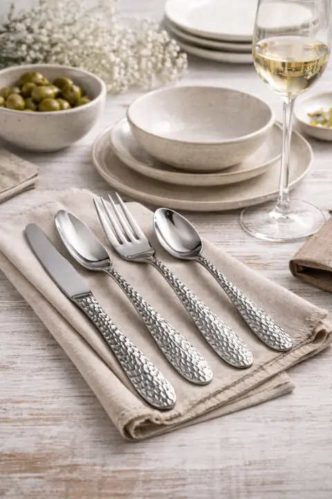 Столові прилади 20-2 – це поєднання сучасного дизайну, елегантності та практичності. Оригінальна текстура на ручках не тільки привертає увагу, але й забезпечує комфорт у використанні. Лаконічний металевий блиск гармонійно доповнює як класичне, так і сучасне сервірування, надаючи столу стильного та завершеного вигляду.