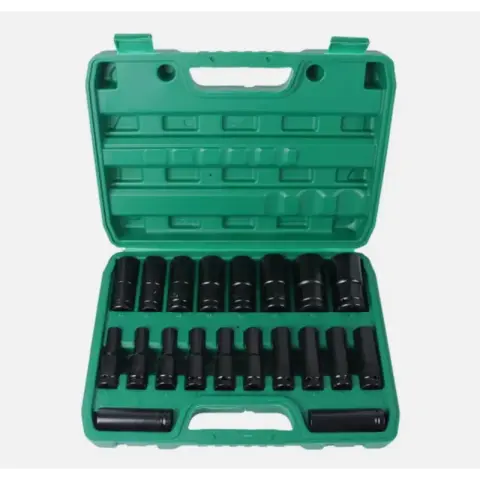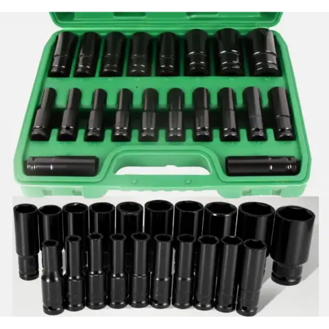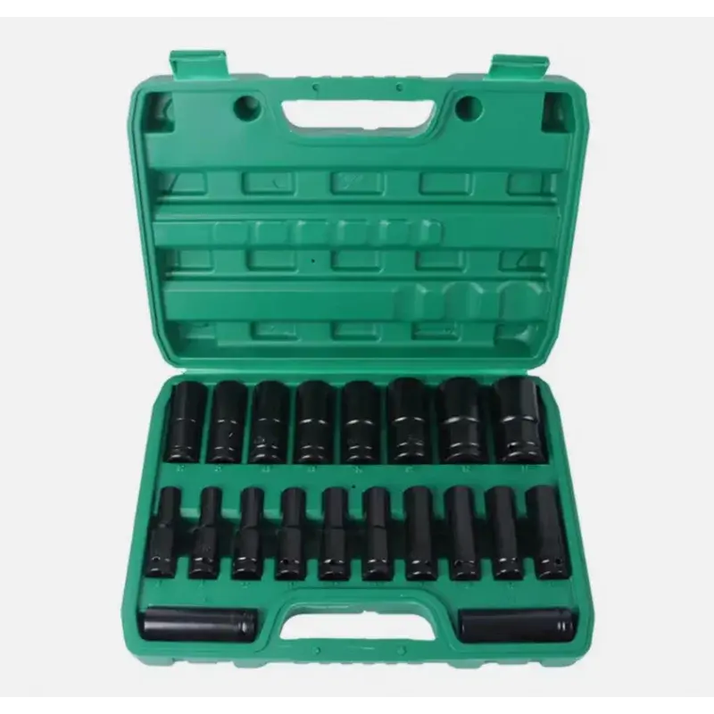 Професійний набір ударних торцевих головок 1/2 дюйма призначений для роботи з гайковертами, тріскачками та іншим інструментом з посадковим квадратом 1/2". Комплект включає 20 глибоких шестигранних головок метричного розміру, які ідеально підходять для ремонту автомобілів, роботи на СТО, майстернях і гаражах.