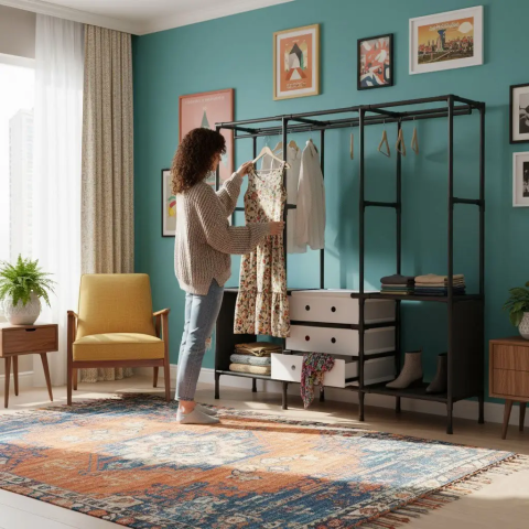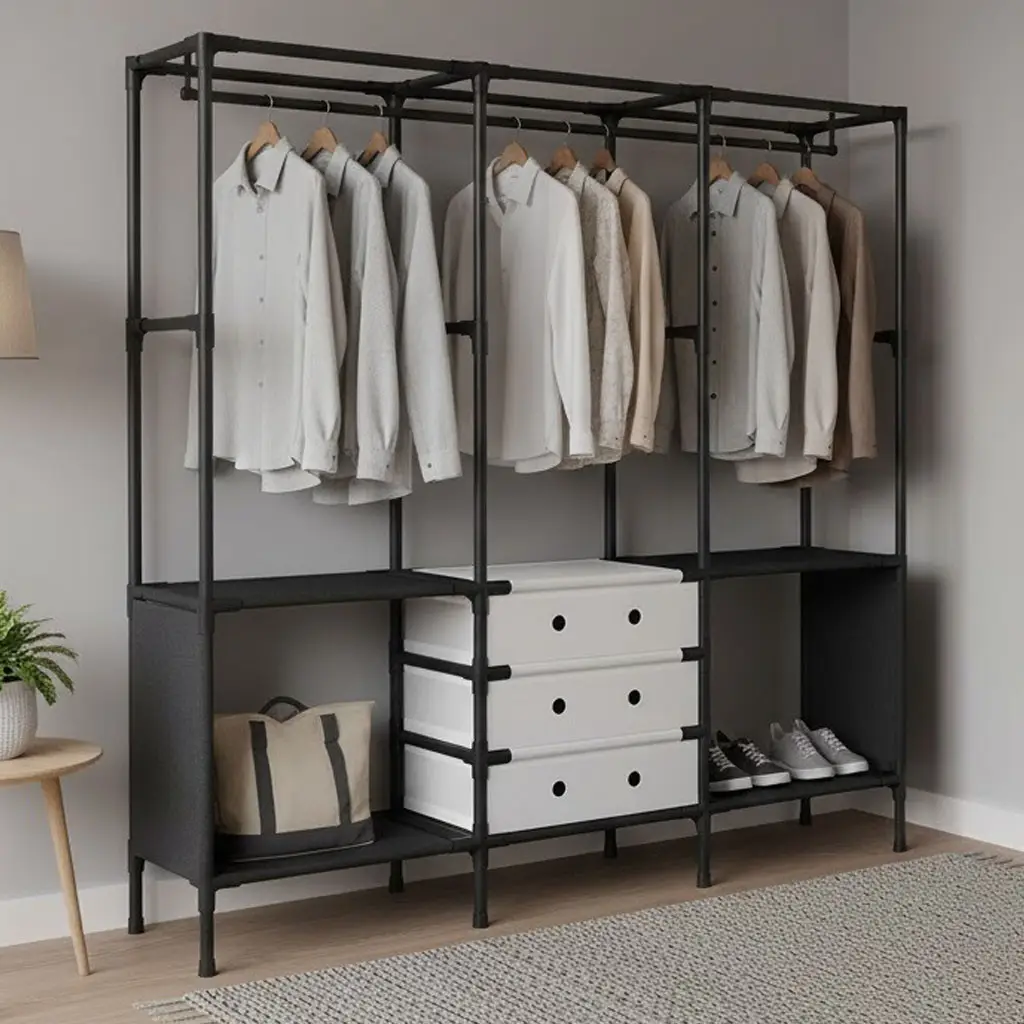 Підлогова вішалка-стійка з полицями / Відкрита шафа для одягу та взуття підлогова з ящиками 122х41х188см