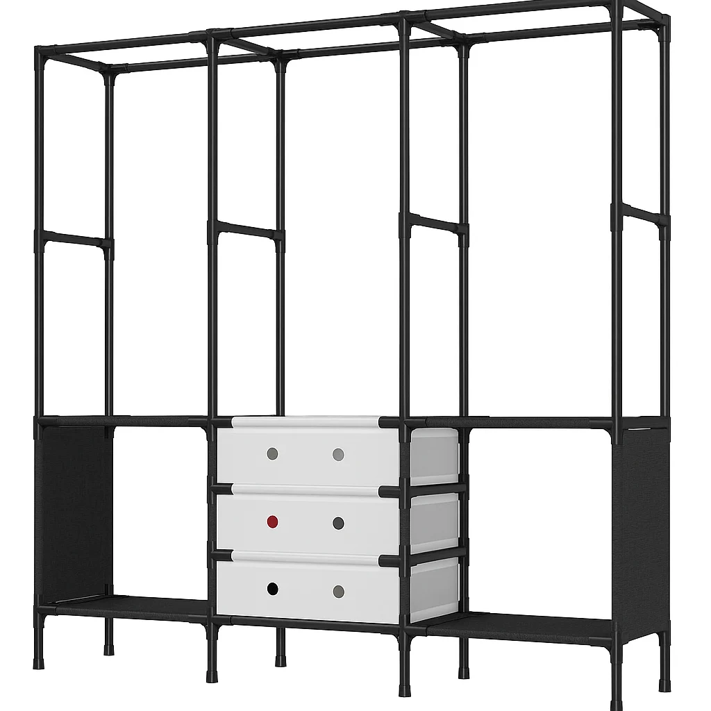 Це ідеальне рішення для організації вашого будинку. Цей стильний гардероб виготовлений з високоякісних сталевих трубок, покритих фарбою, що не тільки надає йому елегантного вигляду, але також забезпечує довговічність та виняткову стійкість. Його продумана конструкція гарантує стабільність і міцність, а значить ви можете бути впевнені, що ваш одяг буде в безпеці та організованості. Гардероб оснащений багатьма практичними полицями, вкритими водонепроникним покриттям, що дозволяють зберігати різні предмети одягу, а також трьома горизонтальними перекладинами для підвішування речей, що полегшує організацію сорочок, курток та суконь. Завдяки шафі ви отримаєте більше місця та порядку у своєму будинку та додасть йому елегантності. Не чекайте більше – інвестуйте в гардероб та насолоджуйтесь найкращою організацією простору!