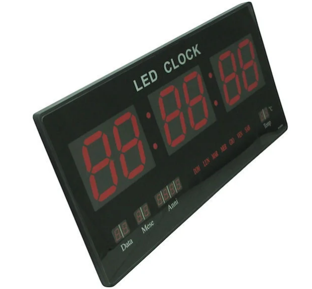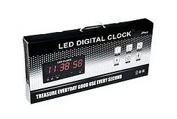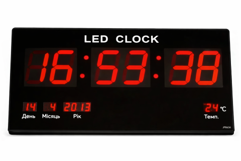 < Сучасні великі настінні електронні LED годинники з календарем і термометром, прості у використанні. Дисплей електронного годинника виконаний зі скла. Кнопки керування розташовані на тильній стороні пристрою.
