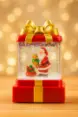 Світильник виконаний у вигляді яскравої подарункової коробки з об'ємною стрічкою та бантом. Усередині – новорічна композиція з фігурками: веселий сніговик або Санта-Клаус, оточений "падаючим снігом", який повільно крутиться завдяки вбудованому механізму циркуляції води. М'яке світлодіодне підсвічування робить композицію ще більш казковою, особливо в темряві.