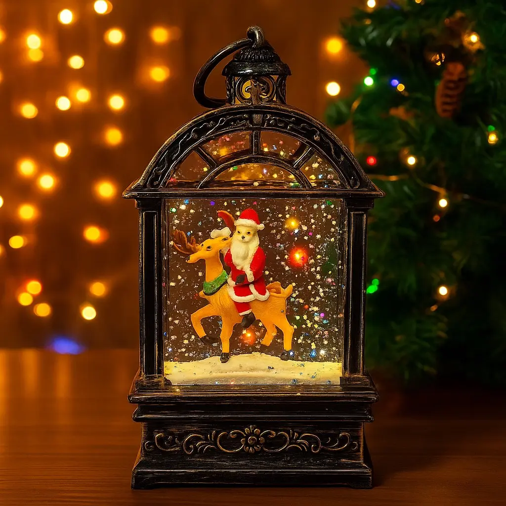 Створіть святкову атмосферу у вашому будинку з цим чарівним новорічним нічником! Санта-Клаус у червоному костюмі їде на олені, оточений блискучими сніжинками та різнокольоровими вогниками, які перетворюють будь-який куточок на казковий світ.