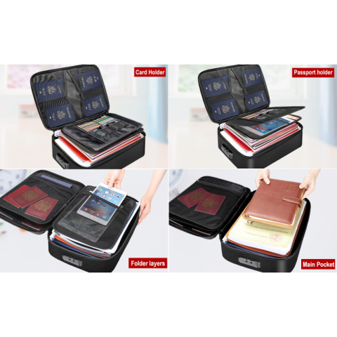 Для подорожей також передбачено ремінь, щоб легко було надіти на ручку валізи та не нести в руках. Є ручка для перенесення. Має велике загальне відділення, а також дві вставки з кишенями різних форматів, для організації невеликих документів, карт та візиток. Органайзер має замок, на якому ви можете встановити індивідуальний код, щоб захистити важливі документи.