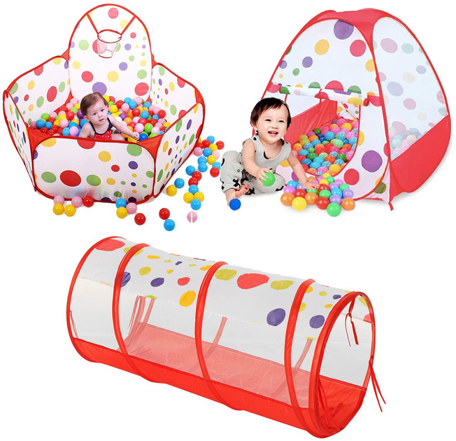 Намітка розміром 85 x 85 x 90 см, тунель завдовжки 112 см. Ігровий майданчик розміром 120 x 120 x 38 см забезпечує достатньо місця для одного або кількох дітей. Простий процес складання та розбирання дозволяє швидко підготувати набір до гри всього за кілька секунд, що ідеально підходить для зайнятих батьків. Набір легко складається та зберігається в комплекті, що займає мало місця, що робить його практичним рішенням.