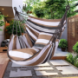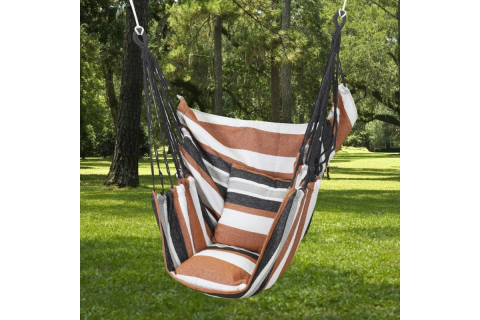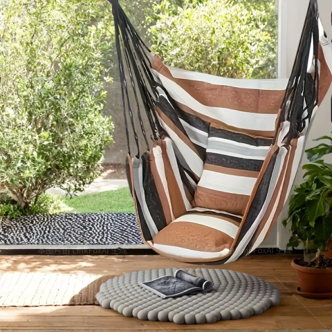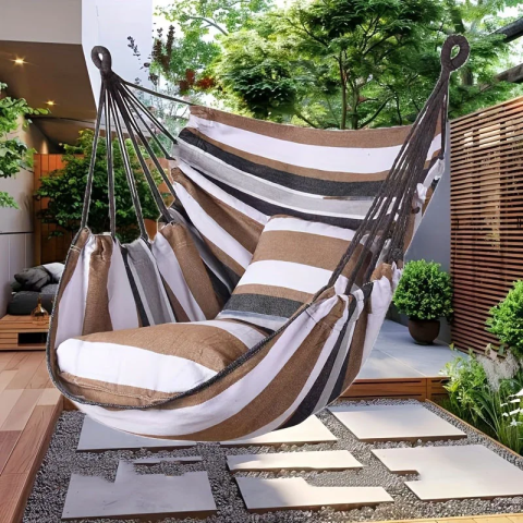 Підвісне крісло-гамак 130х100 см з подушками - це ідеальне рішення для комфортного відпочинку будинку, на дачі або в саду. Стильний смугастий дизайн в натуральних відтінках легко впишеться в будь-який інтер'єр або екстер'єр, додаючи затишку та атмосферу релаксу.