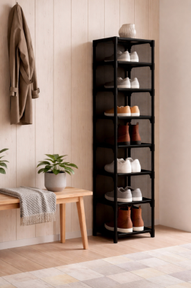 Порядок та функціональність у вашому будинку з цією стильною чорною багатоярусною полицею для взуття. Виготовлена ​​із високоякісних сталевих труб з антикорозійним покриттям, вона забезпечує надійну та довговічну підтримку вашого взуття. Ковпачки на ніжках запобігають ковзанню та захищають підлогу від пошкоджень.