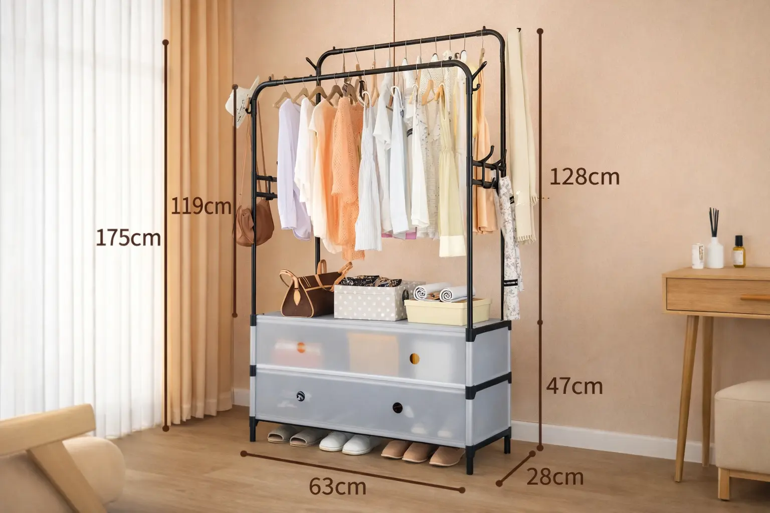 ✔ Дві перекладини для одягу — більше місця для зберігання