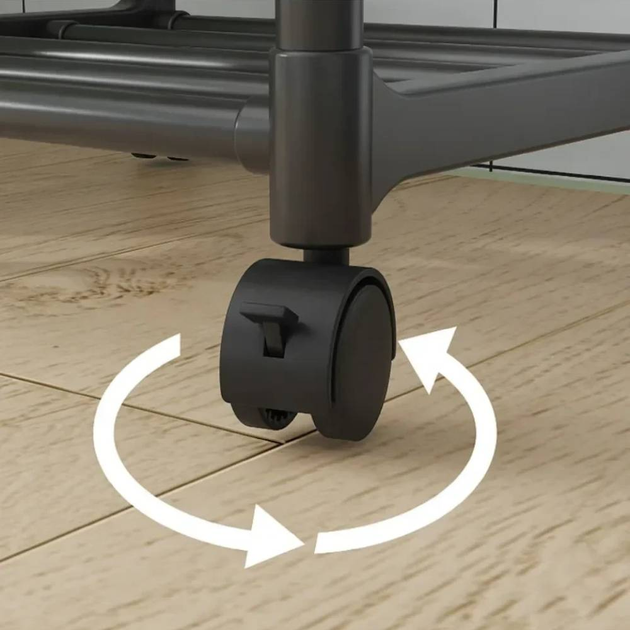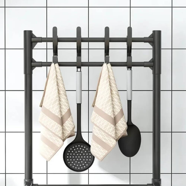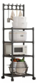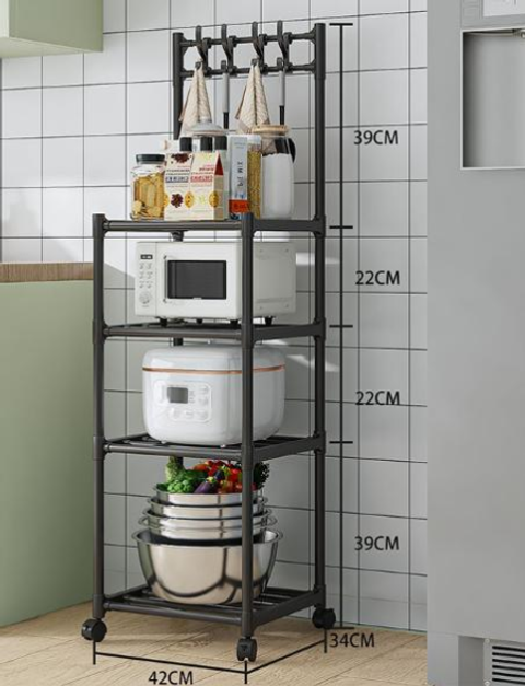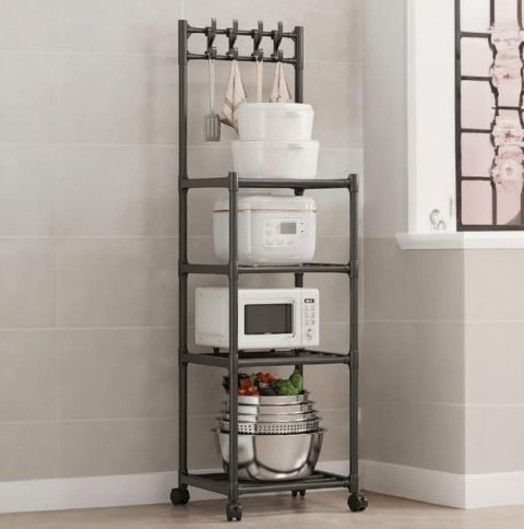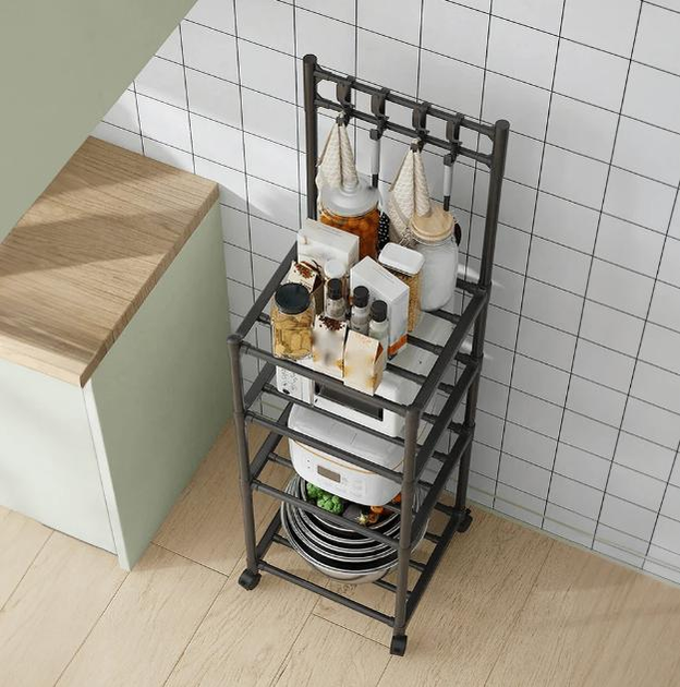 Полиця-стелаж – це функціональна та зручна система зберігання, призначена для оптимізації простору на кухні чи інших приміщеннях. Стелаж оснащений п'ятьма рівнями, що дозволяють розміщувати різноманітні предмети, такі як побутова техніка (мікрохвильова піч, мультиварка), кухонне начиння або продукти. Конструкція із міцного металу забезпечує міцність та довговічність, а бічні гачки ідеально підходять для підвішування кухонних інструментів. Колеса, встановлені на підставі, роблять стелаж мобільним та легко переміщається в межах приміщення.
