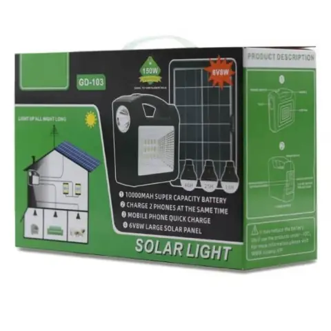 Сонячна панель допоможе вам отримати джерело світла і зарядити ваші пристрої, де б ви не знаходилися. Ви отримуєте автономне джерело енергії навіть при відключенні централізованого живлення або природи. З її допомогою можна зарядити телефон або планшет, а також забезпечити освітлення (світлодіодними лампами, що входять до комплекту) за рахунок вбудованого акумулятора та сонячної енергії. У лампочках використовуються потужні та економічні світлодіоди білого кольору. Їх яскравості достатньо практично для будь-яких завдань, читання чи приготування їжі.