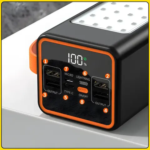Повербанк оснащений кількома вихідними USB-портами для заряджання техніки та окремими входами для заряджання самого пристрою. Вбудований світлодіодний ліхтарик розширює можливості використання, роблячи модель практичною для поїздок, подорожей, кемпінгу та домашнього впровадження. Корпус виконаний у чорному кольорі та доповнений ручкою для зручного перенесення.
