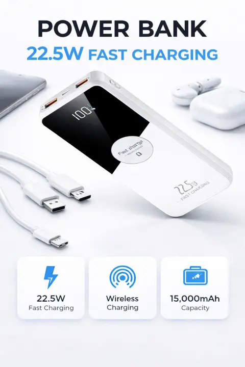 Мощный и компактный Power Bank 15 000 мАч – надежное источник энергии для смартфонов, наушников, часов и других гаджетов. Поддерживает быструю зарядку 22.5W и беспроводную зарядку, что делает его удобным как дома, так и в поездках.