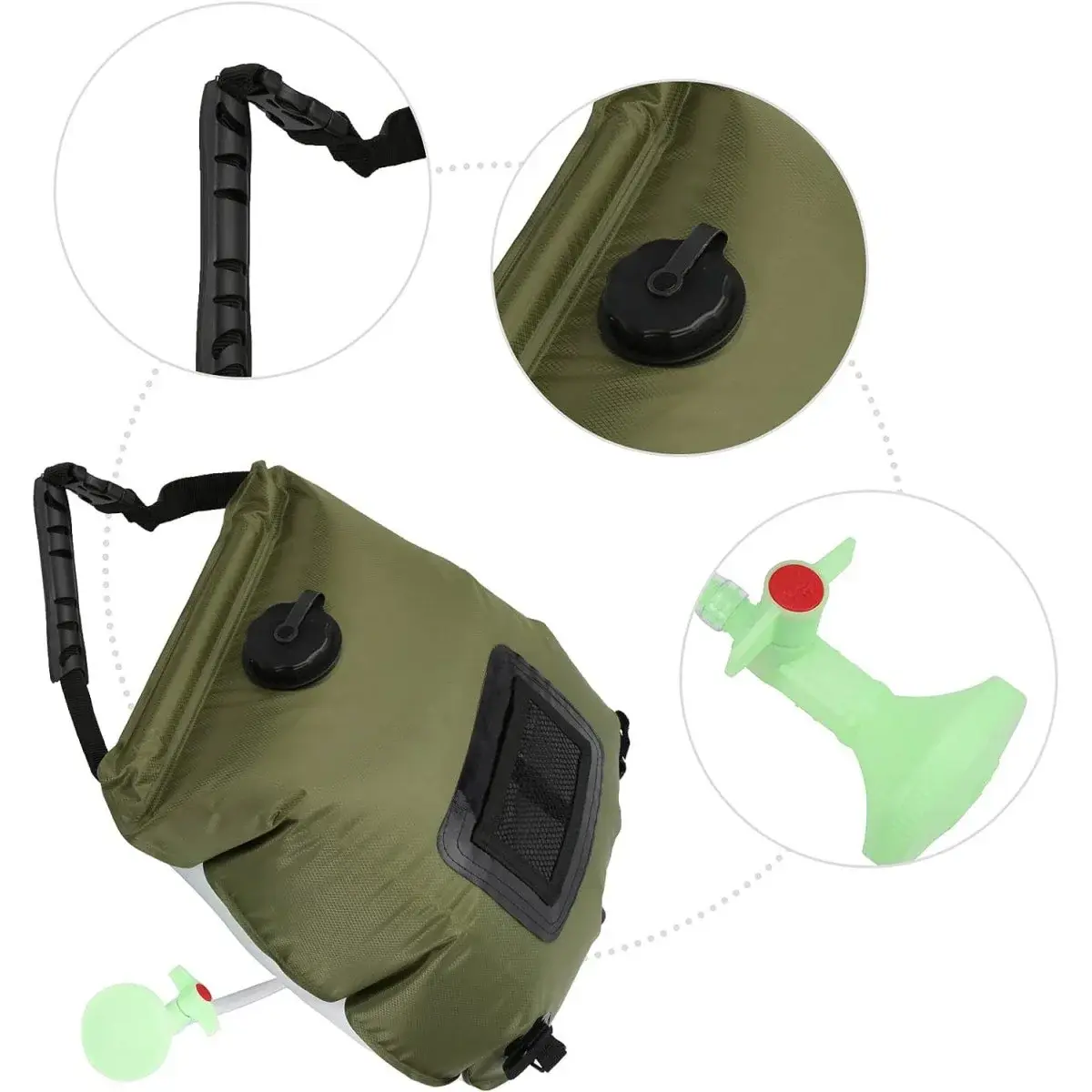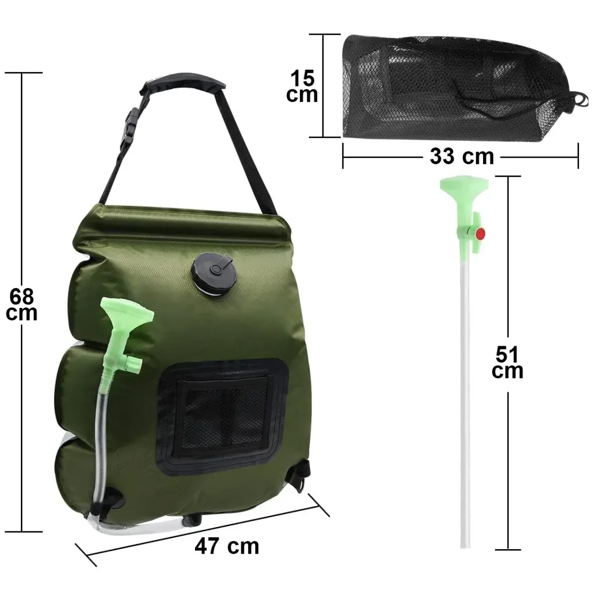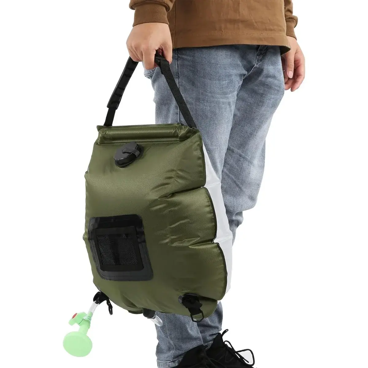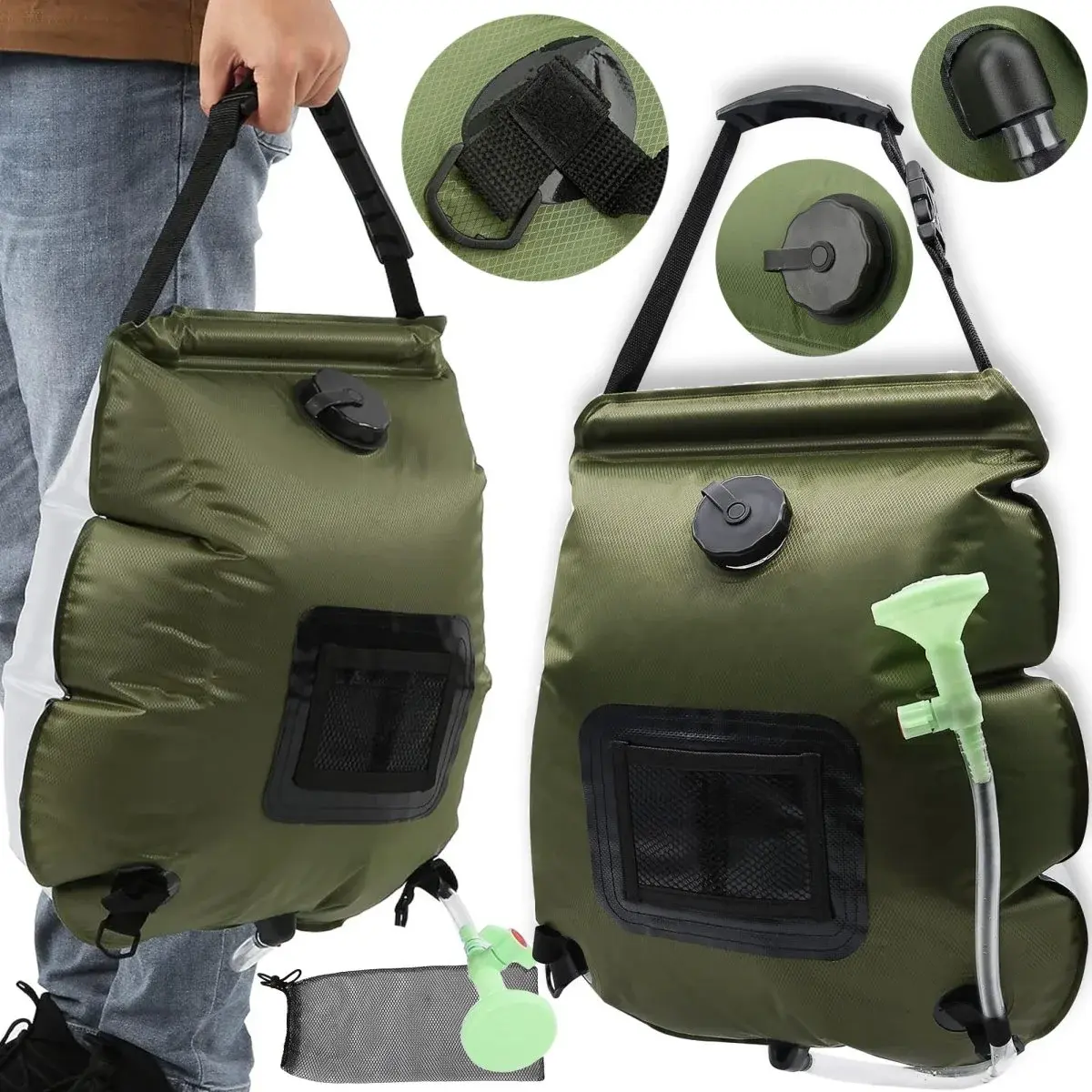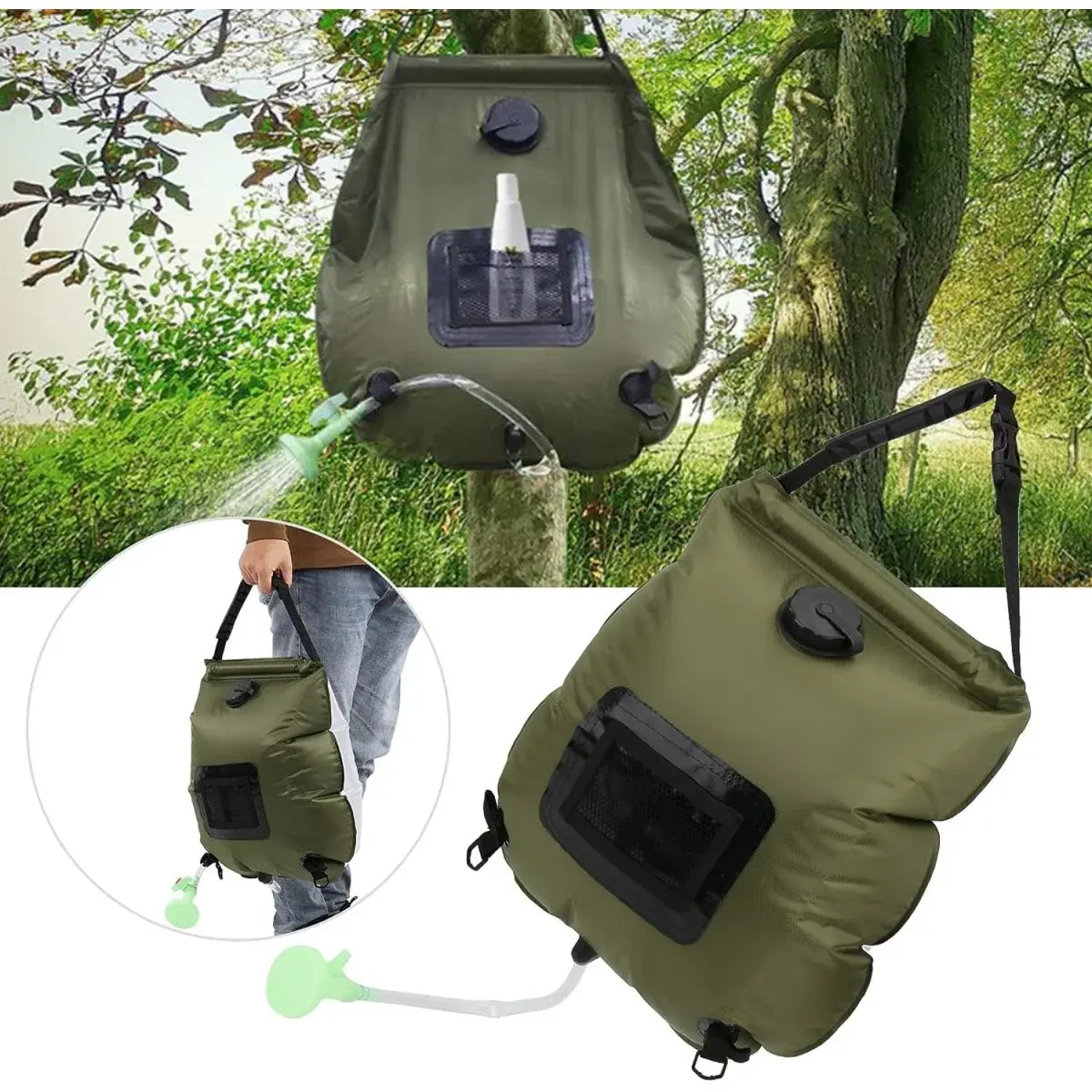 Душ портативний і може бути підвішений на жердині або гілці.