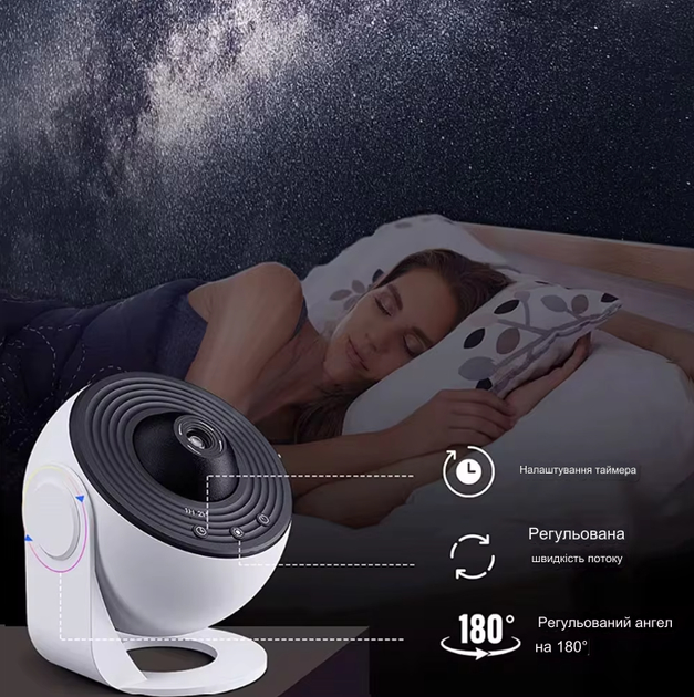 Планетарій можна використовувати як нічник, що проектує зоряне небо на стелі та стінах. У домашньому планетарії є налаштування чіткості фокусування, таймер на 1, 2 та 3 години, вибір 3 режимів роботи (швидке та повільне обертання, а також статична проекція). Проектор нічнк не займає багато місця на столі і простий у використанні, керується за допомогою кнопок на корпусі.