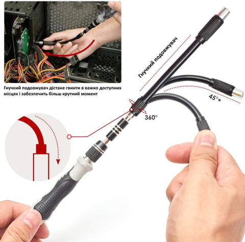 ГУМАНІЗОВАНИЙ ДИЗАЙН: ергономічна й нековзна ручка, її зручно тримати навіть при тривалому використанні. Точний ручний набір інструментів оснащений жорстким подовжувальним валом та гнучким подовжувальним валом, з яким легко дістати навіть до вузького місця, куди звичайна рукоятка не може увійти.