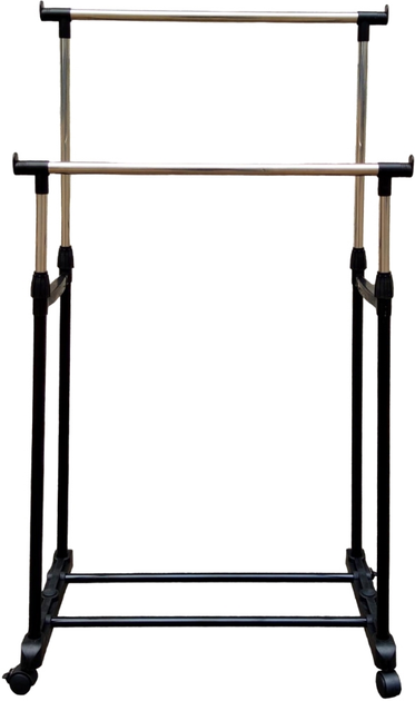 Вешалка изготовлена из крепких стальных и хромированных труб. Он имеет регулировку по высоте от 95 до 165 см. Наличие колесиков позволяет легко транспортировать стойку.