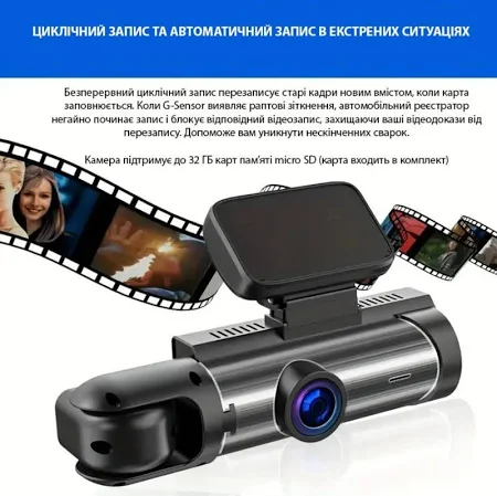 Видеорегистратор с двойной камерой и ночным видением обеспечивает качественную фиксацию ситуации спереди и внутри автомобиля. IPS-экран 3.16 дюйма гарантирует удобный просмотр видео непосредственно на устройстве, а поддержка циклической записи позволяет автоматически перезаписывать старые файлы, чтобы не заботиться о заполнении памяти.