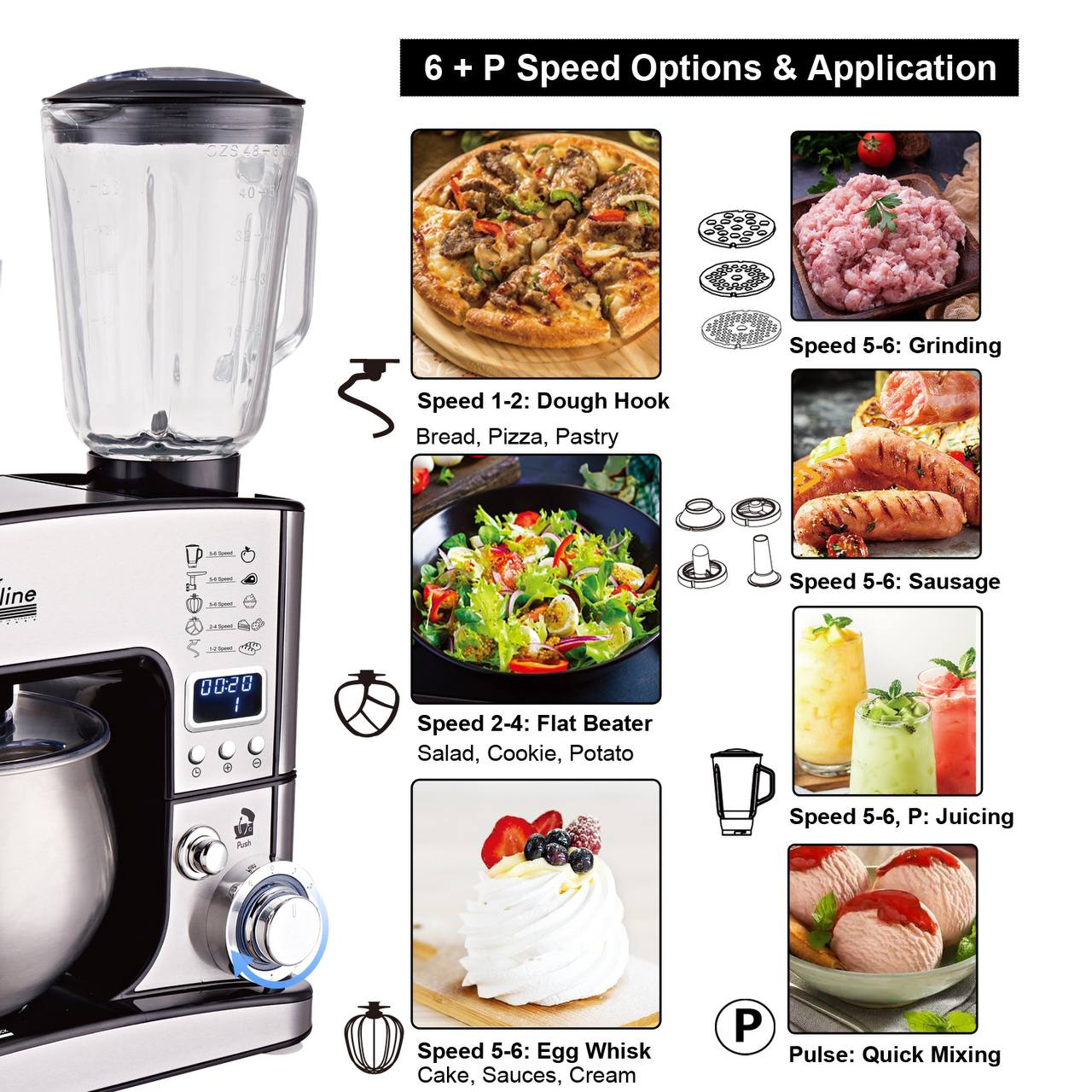 Кухонный комбайн Zepline – отличный спутник на кухне, имеющий много плюсов. Его современный дизайн делает его подходящим для любой кухни. Верхняя часть корпуса выполнена из крепкого пластика, а чаша для замеса теста из нержавеющей стали. Удобная регулировка скорости на боковой панели позволяет легко настраивать работу. Комбайн легко очищается от грязи и оборудован защитой от перегрева. Благодаря присоскам на ножках она надежно фиксируется на разных поверхностях, обеспечивая комфортное использование. Взбивайте с удовольствием! С помощью блендера, изготовленного из плотного стекла с мерной шкалой, вы в считанные минуты можете приготовить смузы и коктейли для всей семьи или просто смолоть овсянку для домашнего овсяного печенья. В этом комбайне есть мясорубка, с помощью которой вы быстро справитесь с измельчением продуктов. Сделать фарш стало проще, выбирайте насадку и перемалывайте любое мясо. Вы любите баловать свою семью вкусной и ароматной выпечкой? Экспериментируете на кухне? Тогда вперед! Благодаря емкой, 7-литровой чаше с тремя разными насадками для замеса теста и приготовления кремов это стало настоящим удовольствием. Вы можете легко смешать ингредиенты для торта, печенья или соуса и радовать свою семью вкусной, домашней выпечкой, в то время как на ее приготовление у вас значительно сократится.