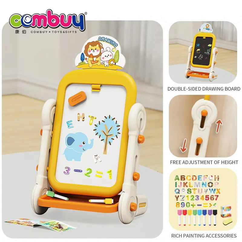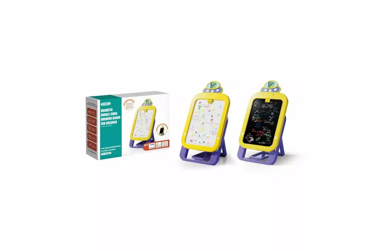 Эта доска с двойной рисовальной поверхностью станет незаменимым помощником в обучении и развлекательных играх для малышей. Удобная регулируемая подставка позволяет настроить высоту доски под рост ребенка, что делает использование еще более комфортным.