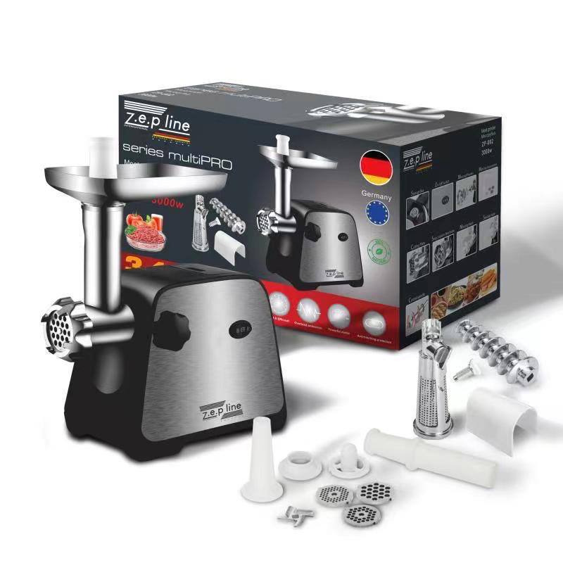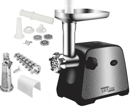 Электрическая мясорубка Zepline ZP-002 мощностью 3000 Вт – многофункциональный прибор, идеальный для приготовления мясного фарша, обработки рыбы, овощей и других продуктов. Также в комплекте есть насадка для приготовления сока. Эта мясорубка оснащена функцией реверса, позволяющей избежать проблемы намотки жилы на шнек.