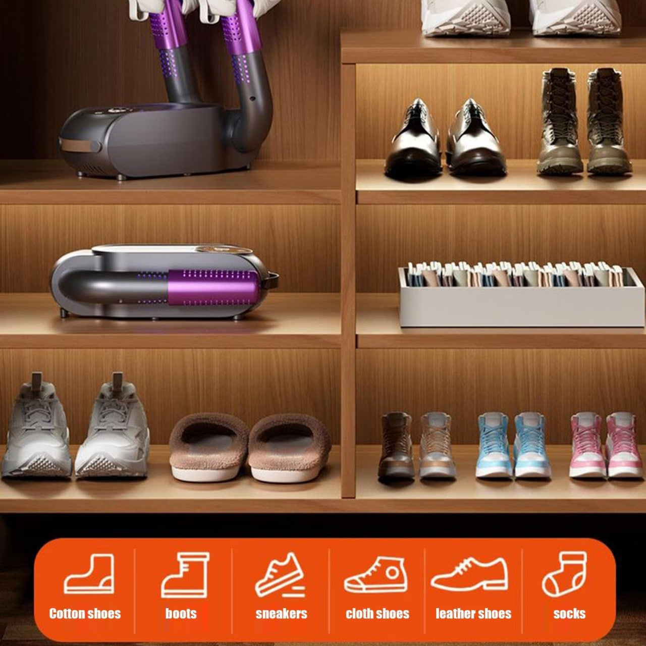 Эффективно сушит ботинки, кроссовки, перчатки и шапки с надежной производительностью, идеально подходит для ежедневного ухода за обувью и аксессуарами, обеспечивая максимальное удобство в повседневной жизни.