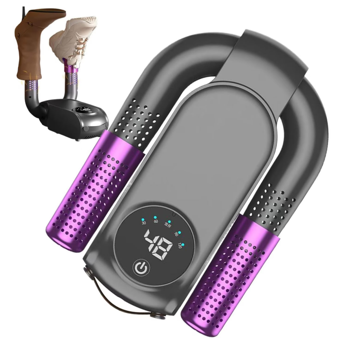 Имеет регулируемые параметры таймера от 30 до 120 минут, обеспечивая полную безопасность за счет предотвращения перегрева и автоматического отключения. Идеально подходит для сушки обуви без присмотра в течение ночи, поддерживая максимальную производительность и длительную защиту обуви.