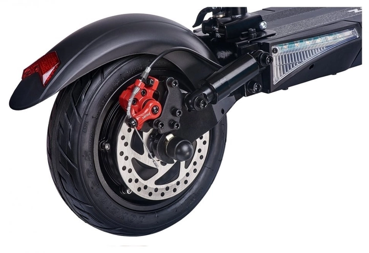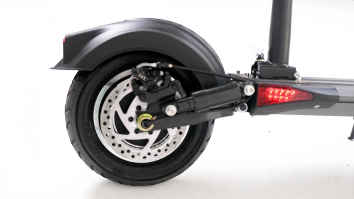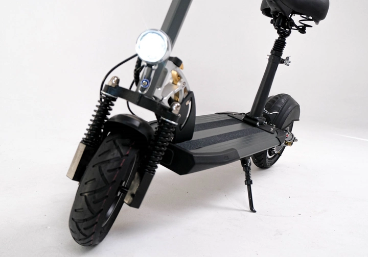Пружинные амортизаторы скрывают неровности дороги, поездка будет более комфортной. Крепкая подножка выдерживает на самокате Tesla 5000 весьма тяжелых ездоков – до 150 килограмм.