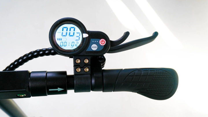 На руле с правой стороны расположены курки ускорения, тормоза, а также бортовой компьютер. Он показывает точную скорость и пробег самоката. Пользователь может включить подсветку, также кнопкой на руле.