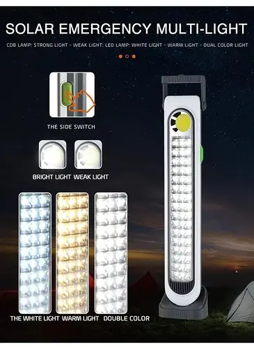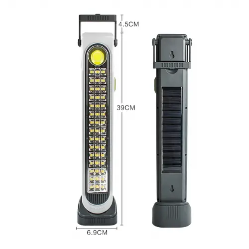 Сверху есть ручка для переноски фонаря и отверстия для возможности крепления на стену. 45 ярких комбинированных светодиодов дают очень яркий свет с мощность 30W. С задней части фонаря есть солнечная панель с помощью которой так же можно подзарядить аккумулятор.