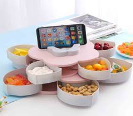 10 отделений, которые располагаются на удобной вращающейся платформе - просто раскройте лепестки и каждый сможет выбрать для себя самое вкусное лакомство.