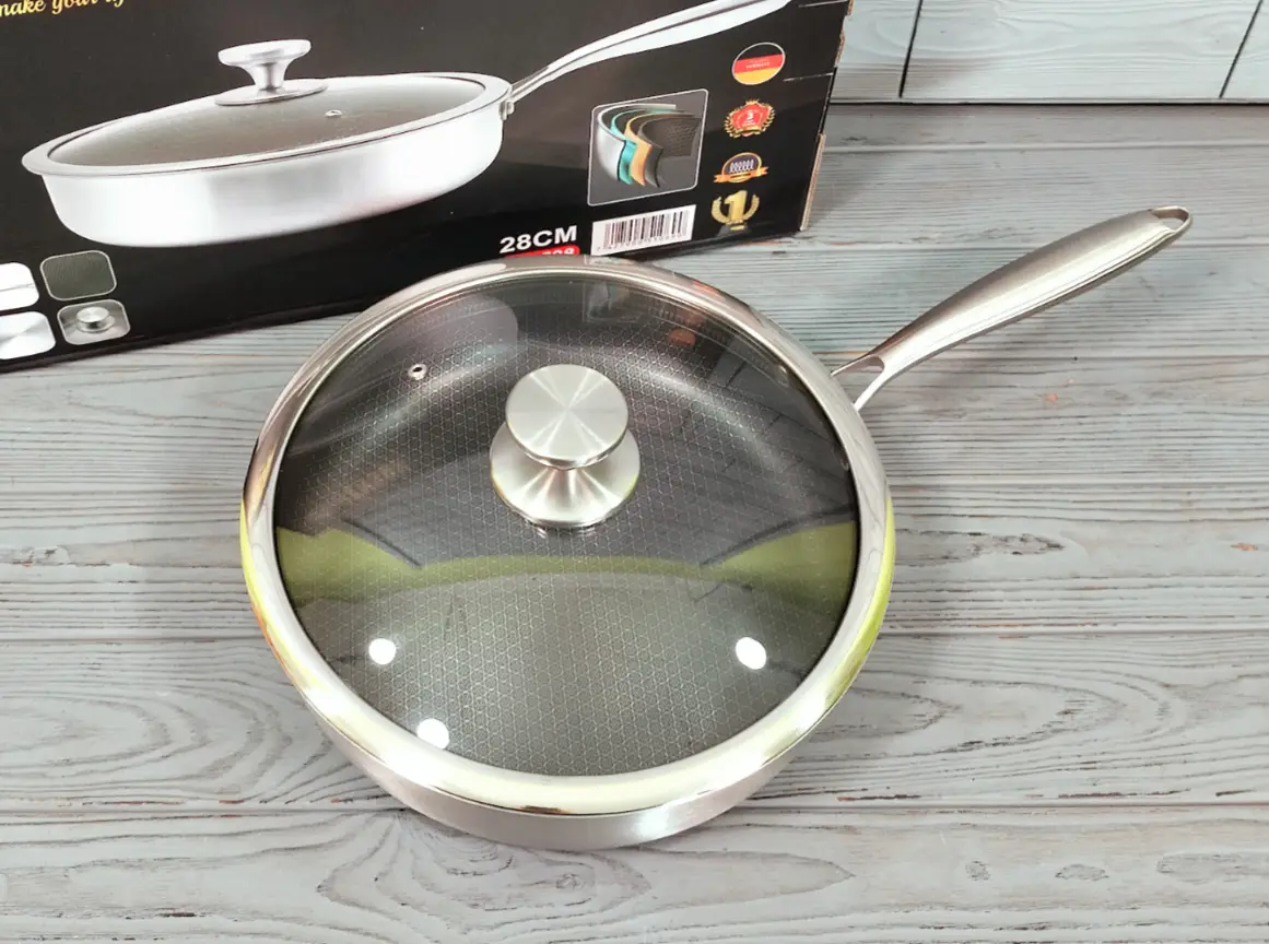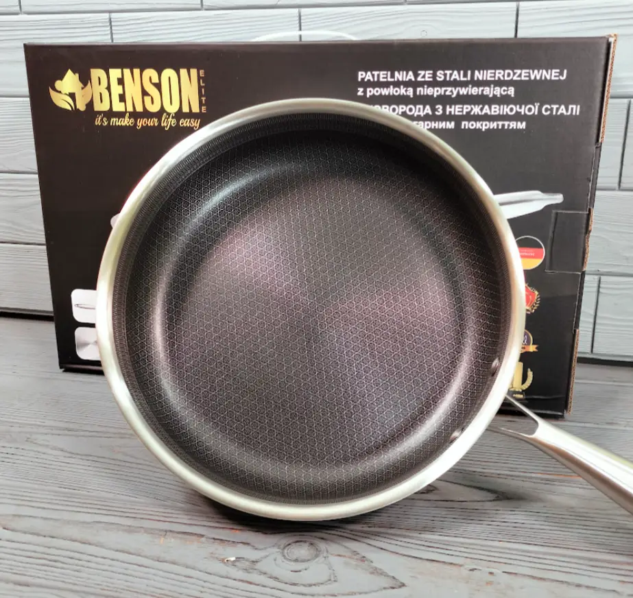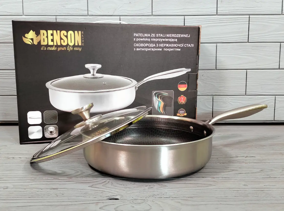 Сковорода глубокая из нержавеющей стали 28 см Benson BN-588 / Сковорода — Сотейник/Скородка профессиональная Профессиональная Сковорода из нержавеющей стали с текстурированным дном. Сковорода состоит из 3-х слоев.