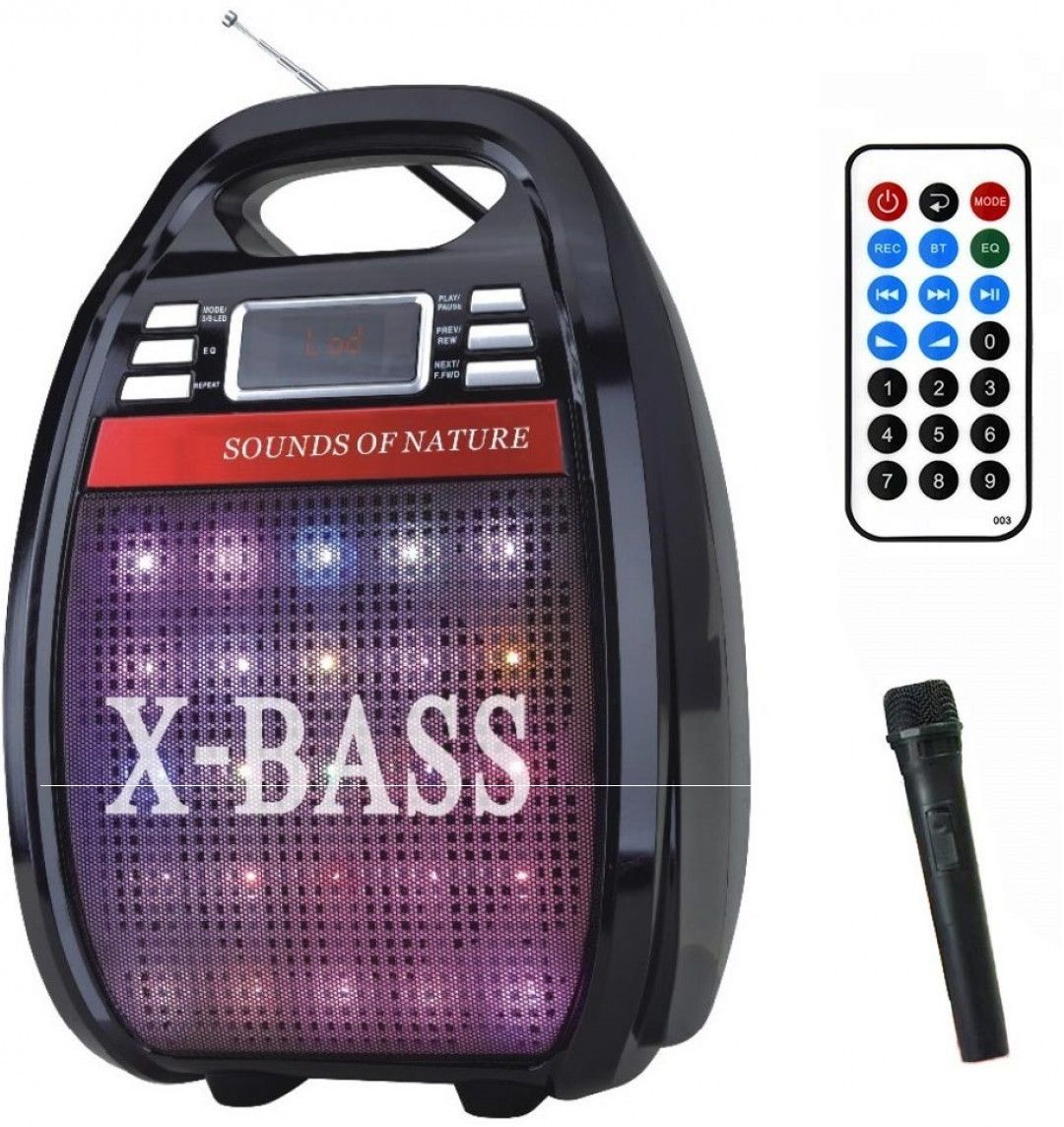 Акустическая система, благодаря беспроводному микрофону (входит в комплект), может быть использована в качестве караоке или же мегафона.