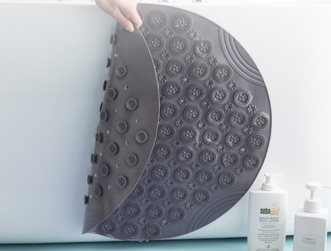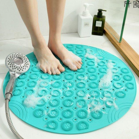 Коврик изготовлен из силикона — материала, который не впитывает воду. Благодаря присоскам на обратной стороне коврика они надежно фиксируются и не позволят подскользнуться. Ухаживать за такими ковриками очень просто. Достаточно просушить его после купания и периодически мыть тряпкой и дезинфицирующими средствами. Данный коврик кладут либо на пол, либо прямо в ванну или в душевую кабинку. Силиконовые коврики очень приятные для ног.