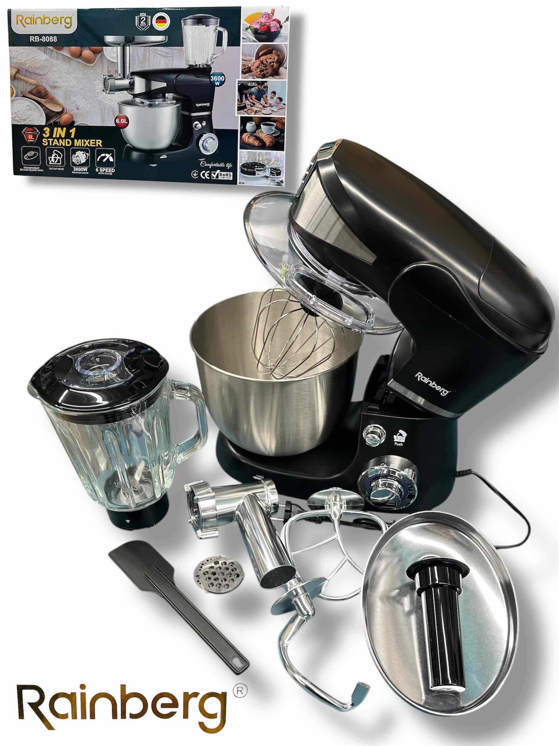 Комбайн Rainberg RB 8088 вироблений із міцних матеріалів, верх — міцний пластик, чаша для замішування тіста виготовлені з неіржавкої сталі, м'ясорубка та всі аксесуари з міцного сплаву металу, чаша блендера виготовлена з товстого скла.