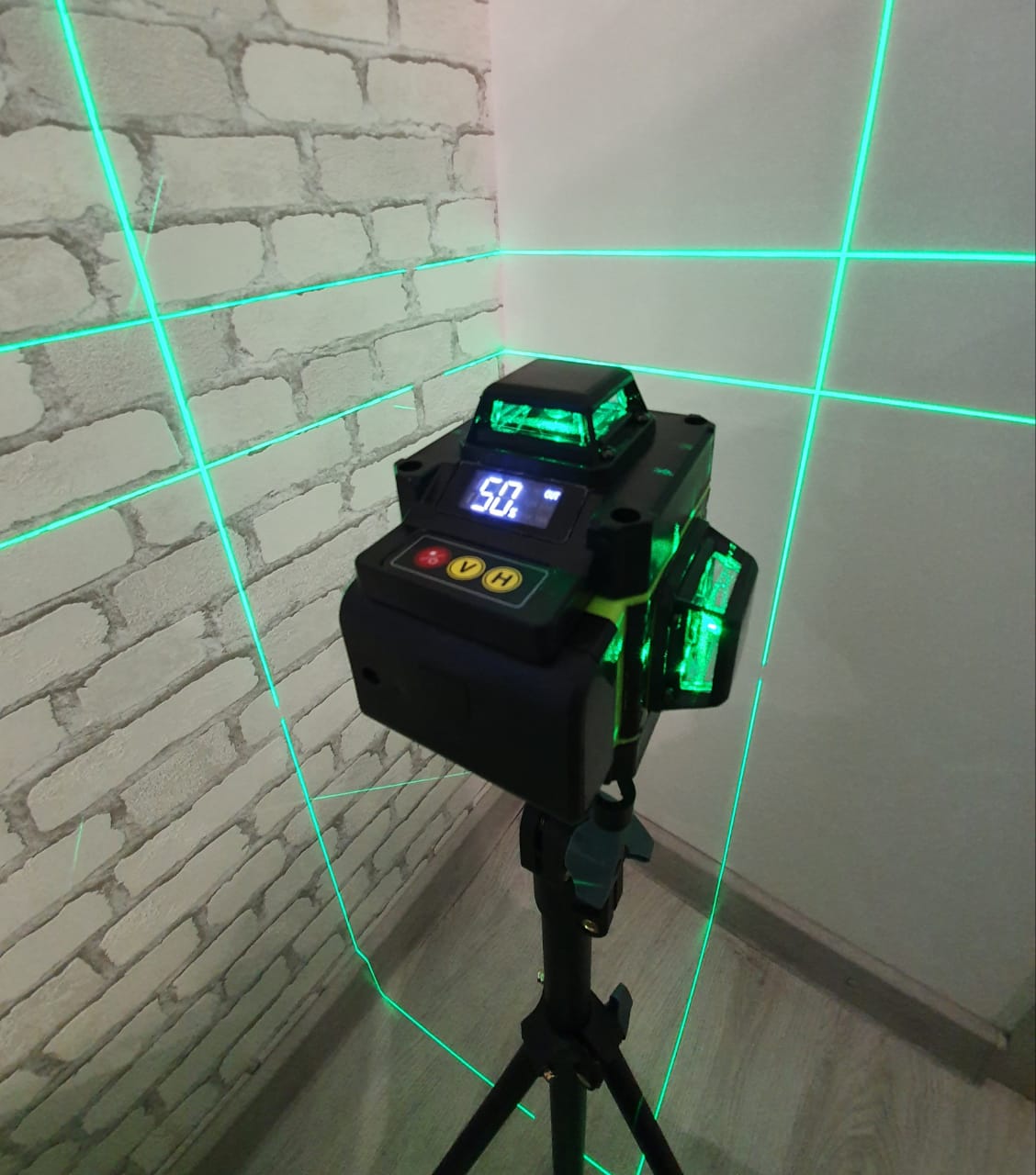 Лазерный уровень с зелеными лучами – 4 взаимоперпендикулярные плоскости (зеленые лучи в разы ярче красных)