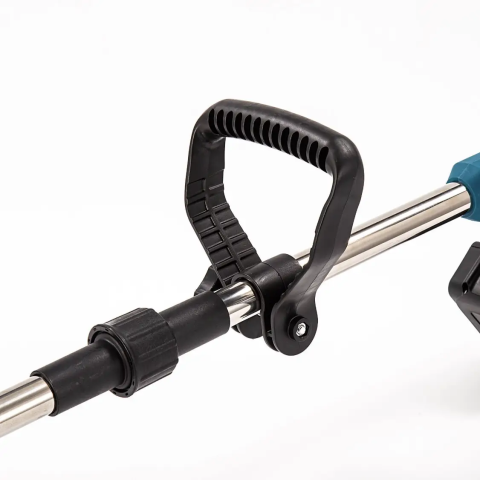 Телескопическая штанга из нержавеющего материала позволяет для удобства увеличить длину до 122 см. Удобная ручка с защитой от незапланированного включения (двойная кнопка), защитный кожух.