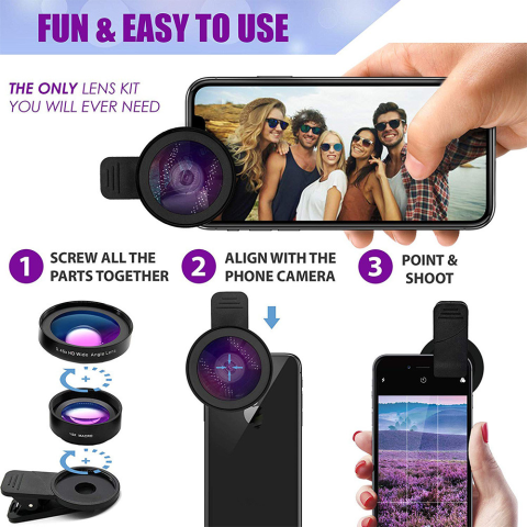 Защелкивающийся дизайн делает объектив камеры простым в использовании, съемными и переносными зажимами с мягкой резиной, предохраняя от ударов и царапин на вашем устройстве. Идеальный дизайн подходит для фотографий, путешествий, селфов и других целей. Его легко устанавливать и снимать, чтобы использовать широкоугольный объектив вам просто нужно соединить оба объектива и открутить широкоугольный объектив, если вы хотите использовать макрообъектив.