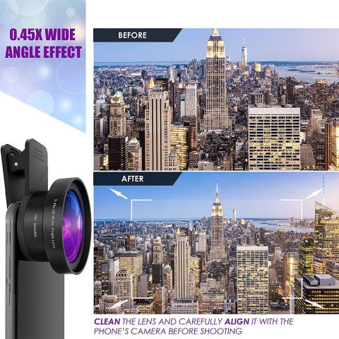 Супер широкоугольный объектив 0,45X: широкоугольный объектив увеличивает угол обзора на 140%. Он открывает поле зрения с широкоугольным изображением высокой четкости без искажений для получения красивых эффектов.